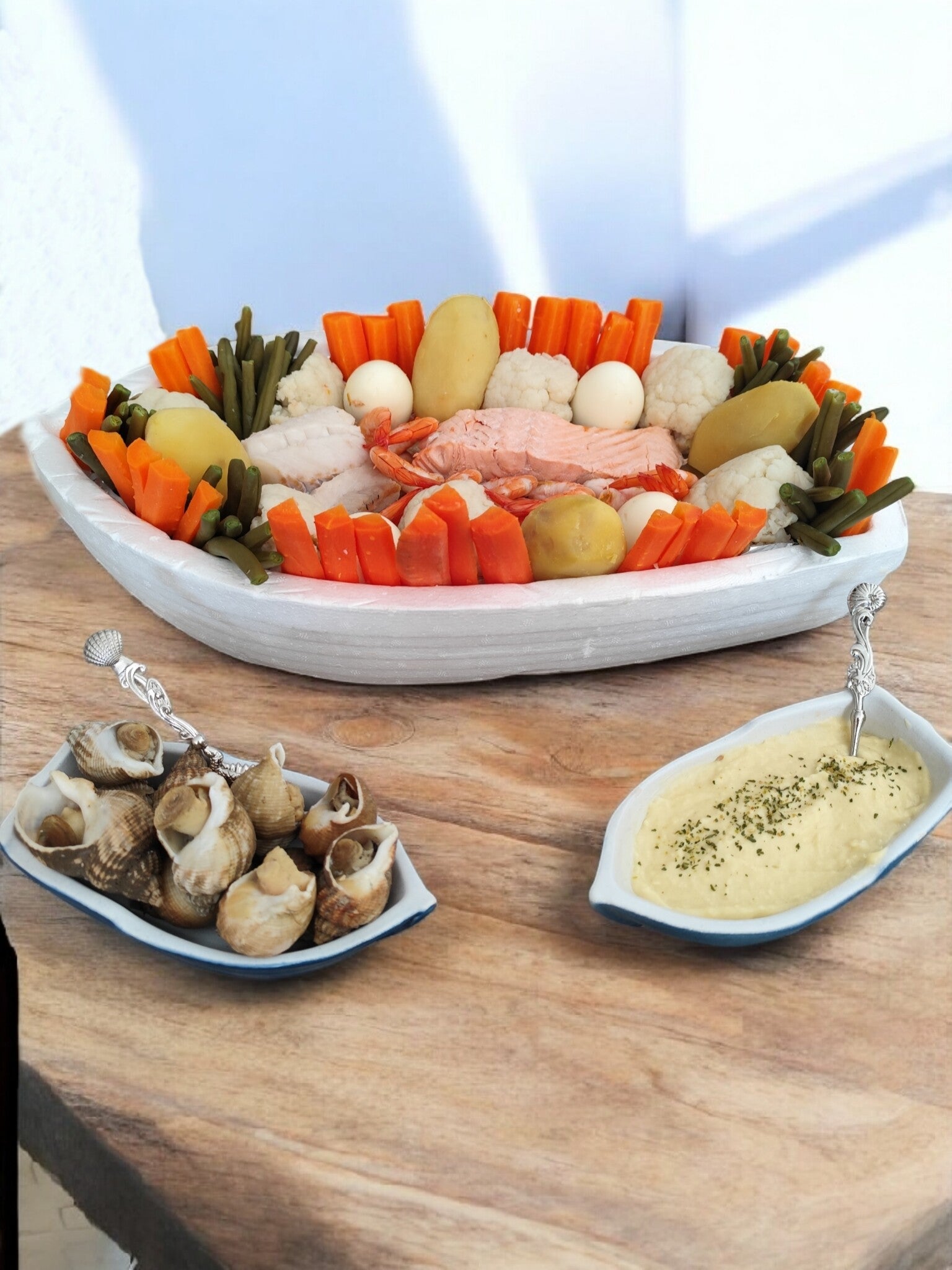 Aïoli maison ,( légumes frais ) pomme de terres , carottes , choux-fleur,haricots verts,oeufs,duo de poissons frais,crevettes,bulots et vin au choix .